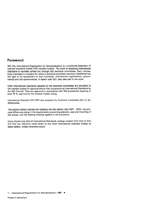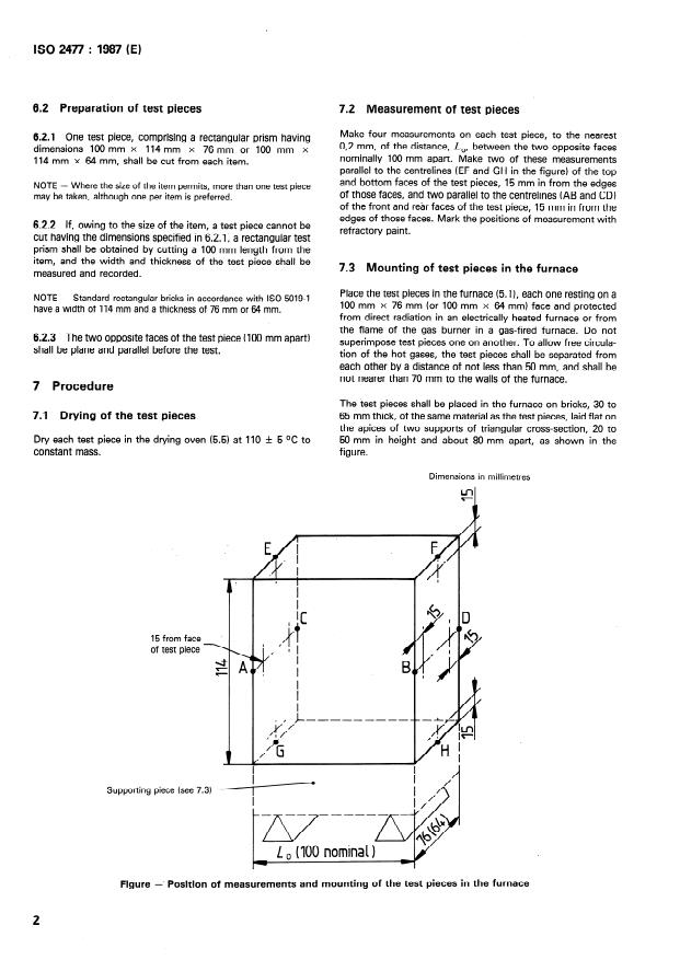 ISO 2477:1987 is a standard published by the International Organization for Standardization (ISO). Its full title is "Shaped insulating refractory products — Determination of permanent change in dimensions on heating". This standard covers: Specifies a method for determining the permanent change in dimensions on heating of a shaped insulating refractory product. A figure shows the position of measurements and mounting of the test pieces in the furnace. This second edition cancels and replaces the first edition (1973).