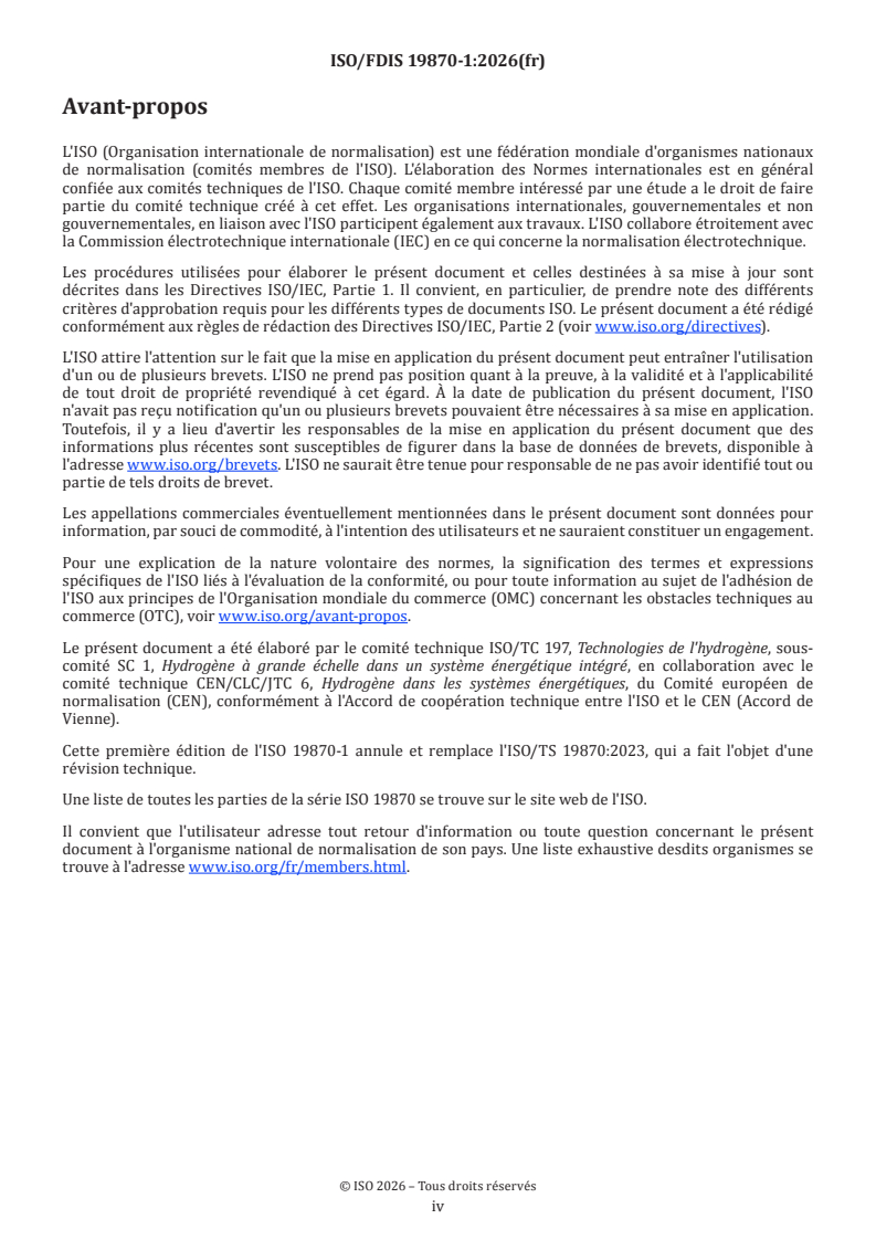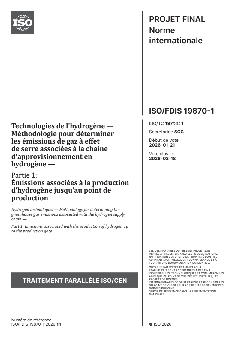 ISO/FDIS 19870-1 - Technologies de l'hydrogène — Méthodologie pour déterminer les émissions de gaz à effet de serre associées à la chaîne d'approvisionnement en hydrogène — Partie 1: Émissions associées à la production d'hydrogène jusqu'au point de production/14/2026