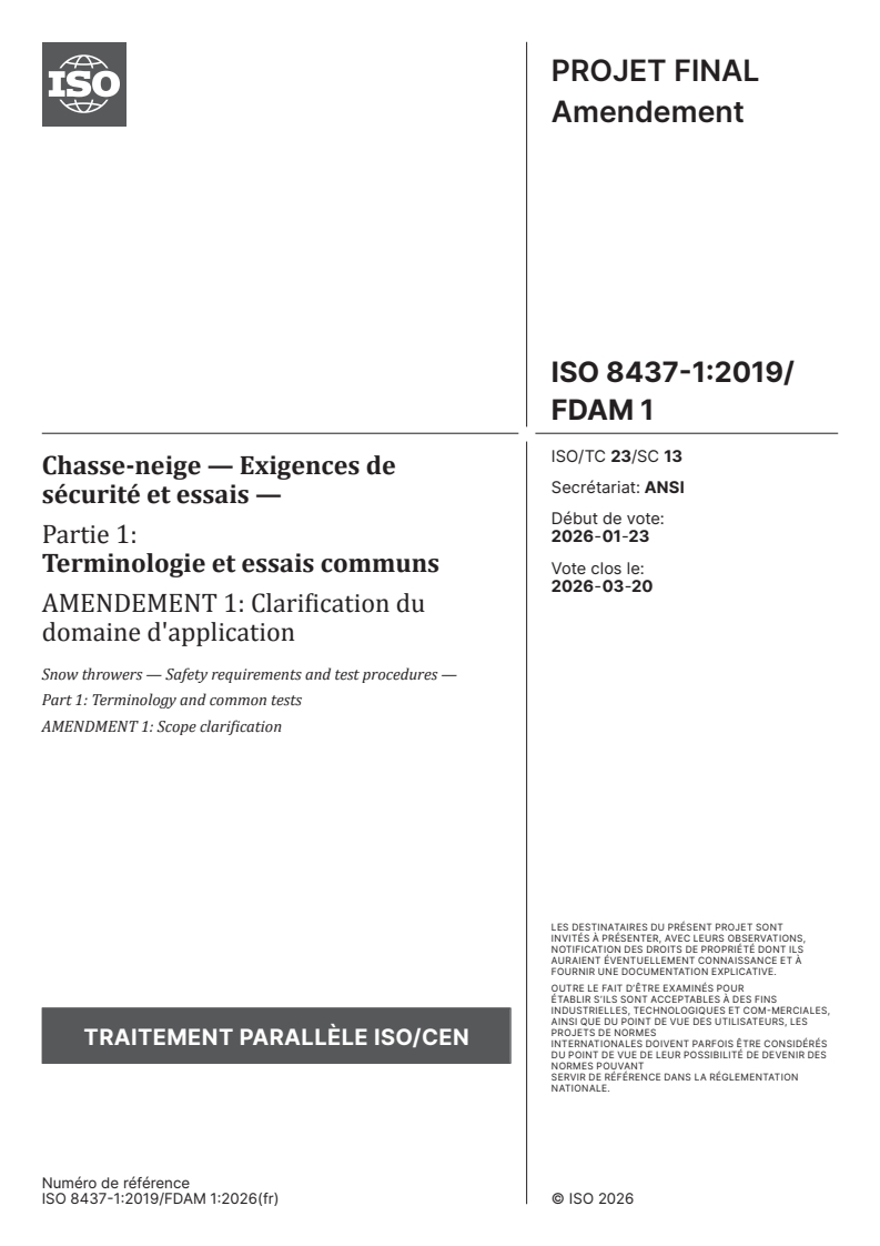 ISO 8437-1:2019/FDAmd 1 - Chasse-neige — Exigences de sécurité et essais — Partie 1: Terminologie et essais communs — Amendement 1: Clarification du domaine d'application Released:3. 02. 2026