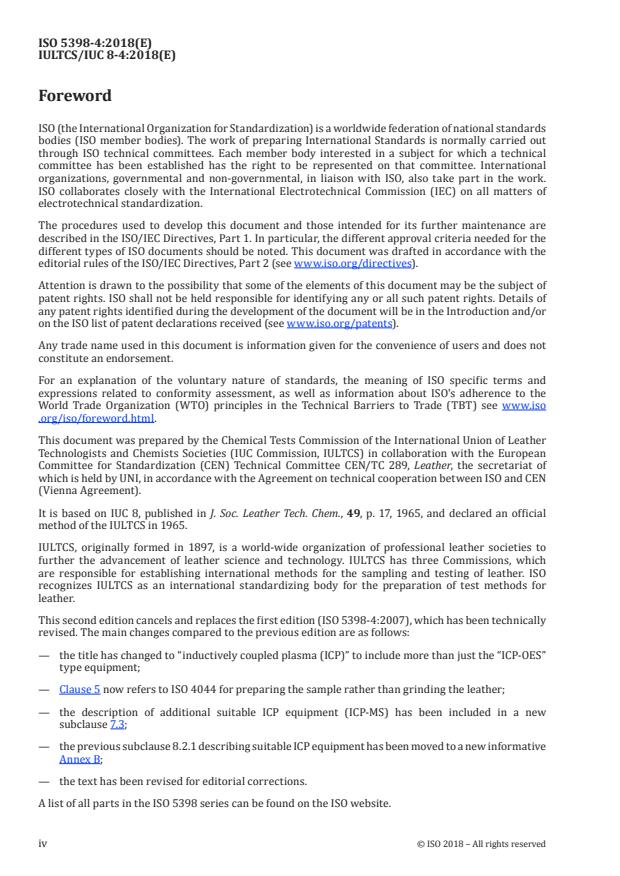 ISO 5398-4:2018 is a standard published by the International Organization for Standardization (ISO). Its full title is "Leather — Chemical determination of chromic oxide content — Part 4: Quantification by inductively coupled plasma (ICP)". This standard covers: This document describes a method for the determination of chromium in aqueous solution obtained from leather. This is an analysis for total chromium in leather; it is not compound specific or specific to its oxidation state. This method describes the determination of chromium by inductively coupled plasma (ICP) and is applicable to leathers which are expected to have chromic oxide contents in excess of 1 mg/kg. Two techniques for the preparation of the solution to be analysed are included. In the event of dispute, the wet oxidation technique is intended to be used.