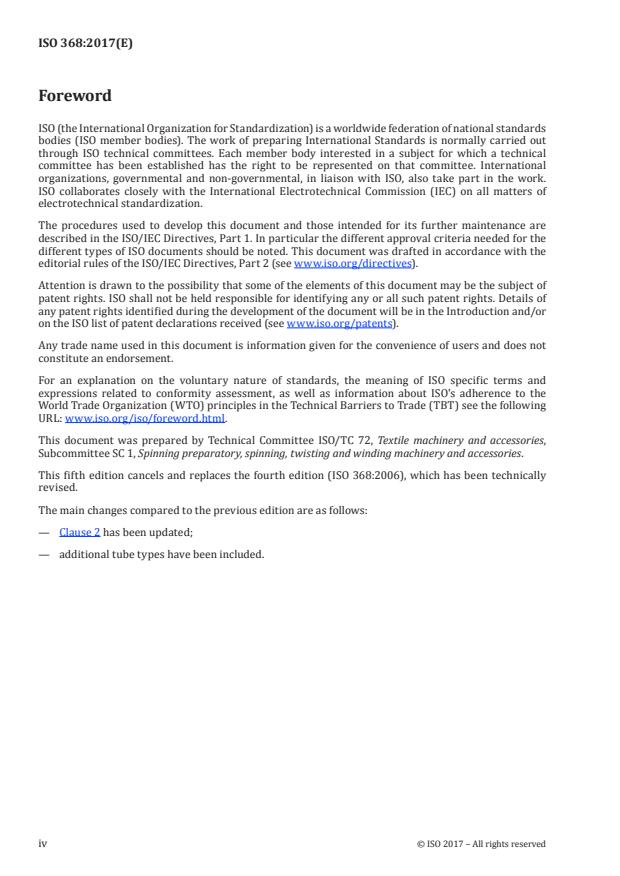 ISO 368:2017 is a standard published by the International Organization for Standardization (ISO). Its full title is "Spinning preparatory, spinning and doubling (twisting) machinery — Tubes for ring-spinning, doubling and twisting spindles, taper 1:38 and 1:64". This standard covers: ISO 368:2017 specifies the dimensions (length and inner diameter) and permissible total run-out tolerances of tubes with taper 1:38 and 1:64 for ring-spinning, doubling and twisting spindles used in the textile industry. It also specifies the dimensions and tolerances of the gauges for checking the tubes.