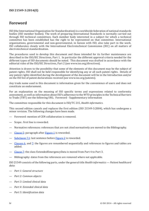 ISO 21549-3:2014 - "Health informatics - Patient healthcard data - Part 3: Limited clinical data" defines the structure and data objects for storing and transporting limited clinical information on patient-held healthcards that follow the ID-1 physical dimensions (ISO/IEC 7810). The standard describes limited clinical data objects using UML, plain text and Abstract Syntax Notation (ASN.1). It specifies the basic structure of the data object LimitedClinicalData (intended to aid emergency care) but does not mandate specific data sets or the security mechanisms used to protect them.