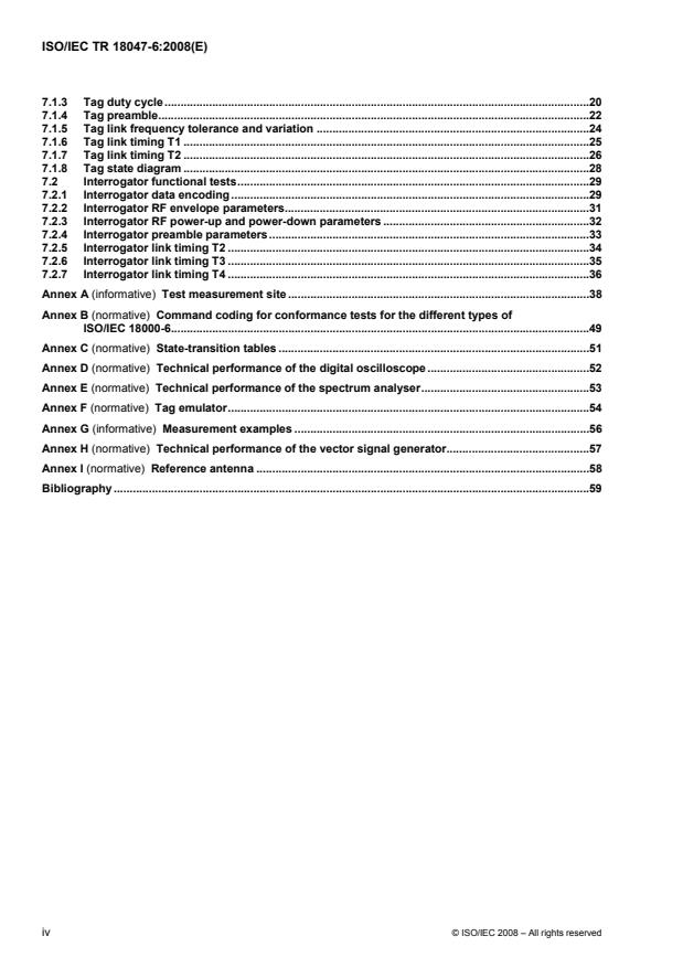 ISO/IEC 18000 defines the air interfaces for radio frequency identification (RFID) devices used in item management applications. ISO/IEC 18000-6 defines the air interface for these devices operating at frequencies from 860 MHz to 960 MHz. ISO/IEC TR 18047 provides test methods for conformance with the various parts of ISO/IEC 18000. Each part of ISO/IEC TR 18047 contains all measurements required to be made on a product in order to establish whether it conforms to the corresponding part of ISO/IEC 18000. For ISO/IEC TR 18047-6:2008, each interrogator needs to be assessed for operation with both types A and B, while each tag is only required to support at least one of the types A or B or C. Measurement of tag and interrogator performance is covered by ISO/IEC 18046. ISO/IEC TR 18047-6:2008 defines test methods for determining the conformance of radio frequency identification devices (tags and interrogators) for item management with the specifications given in ISO/IEC 18000-6, but does not apply to the testing of conformity with regulatory or similar requirements. The test methods require only that the mandatory functions, and any optional functions which are implemented, be verified. This may, in appropriate circumstances, be supplemented by further application-specific functionality criteria that are not available in the general case. The interrogator and tag conformance parameters in ISO/IEC TR 18047-6:2008 are the following: type-specific conformance parameters including nominal values and tolerances; parameters that apply directly affecting system functionality and inter-operability. The following are not included in ISO/IEC TR 18047-6:2008: parameters that are already included in regulatory test requirements; high-level data encoding conformance test parameters (these are specified in ISO/IEC 15962). Unless otherwise specified, the tests in ISO/IEC TR 18047-6:2008 are to be applied exclusively to RFID tags and interrogators defined in ISO/IEC 18000-6. ISO/IEC TR 18047-6:2008 also describes all necessary conformance tests.