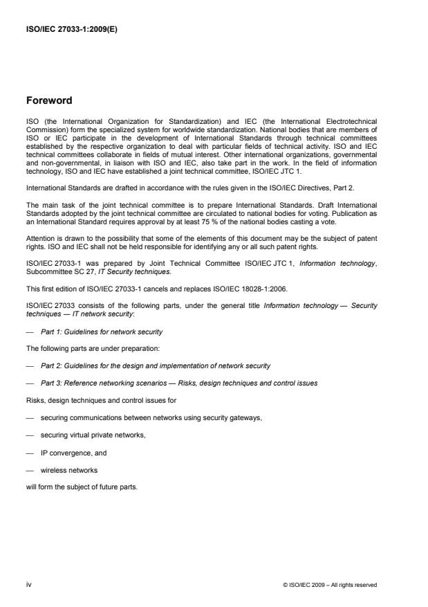 ISO/IEC 27033-1:2009 is a standard published by the International Organization for Standardization (ISO). Its full title is "Information technology — Security techniques — Network security — Part 1: Overview and concepts". This standard covers: ISO/IEC 27033-1:2009 provides an overview of network security and related definitions. It defines and describes the concepts associated with, and provides management guidance on, network security. (Network security applies to the security of devices, security of management activities related to the devices, applications/services and end-users, in addition to security of the information being transferred across the communication links.) It is relevant to anyone involved in owning, operating or using a network. This includes senior managers and other non-technical managers or users, in addition to managers and administrators who have specific responsibilities for information security and/or network security, network operation, or who are responsible for an organization's overall security program and security policy development. It is also relevant to anyone involved in the planning, design and implementation of the architectural aspects of network security. ISO/IEC 27033-1:2009 also provides guidance on how to identify and analyse network security risks and the definition of network security requirements based on that analysis, provides an overview of the controls that support network technical security architectures and related technical controls, as well as those non-technical controls and technical controls that are applicable not just to networks, introduces how to achieve good quality network technical security architectures, and the risk, design and control aspects associated with typical network scenarios and network “technology” areas (which are dealt with in detail in subsequent parts of ISO/IEC 27033), and briefly addresses the issues associated with implementing and operating network security controls, and the on-going monitoring and reviewing of their implementation. Overall, it provides an overview of the ISO/IEC 27033 series and a “road map” to all other parts.