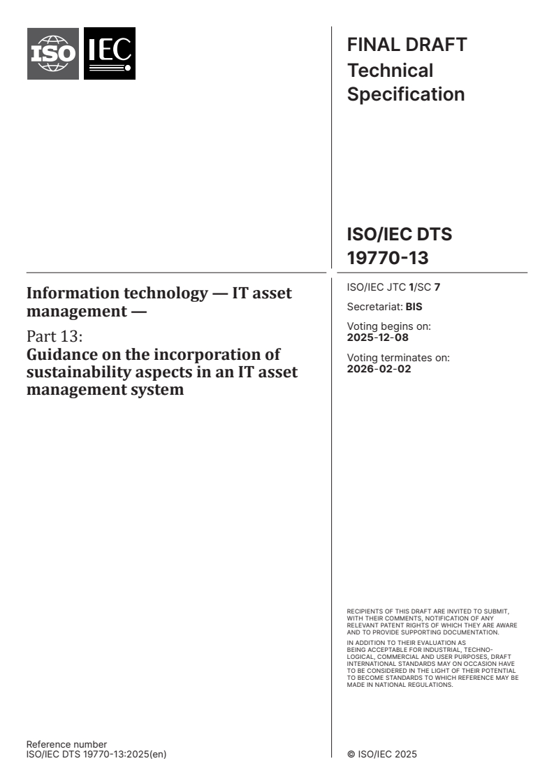 ISO/IEC DTS 19770-13 - Information technology — IT asset management — Part 13: Guidance on the incorporation of sustainability aspects in an IT asset management system Released:11/24/2025