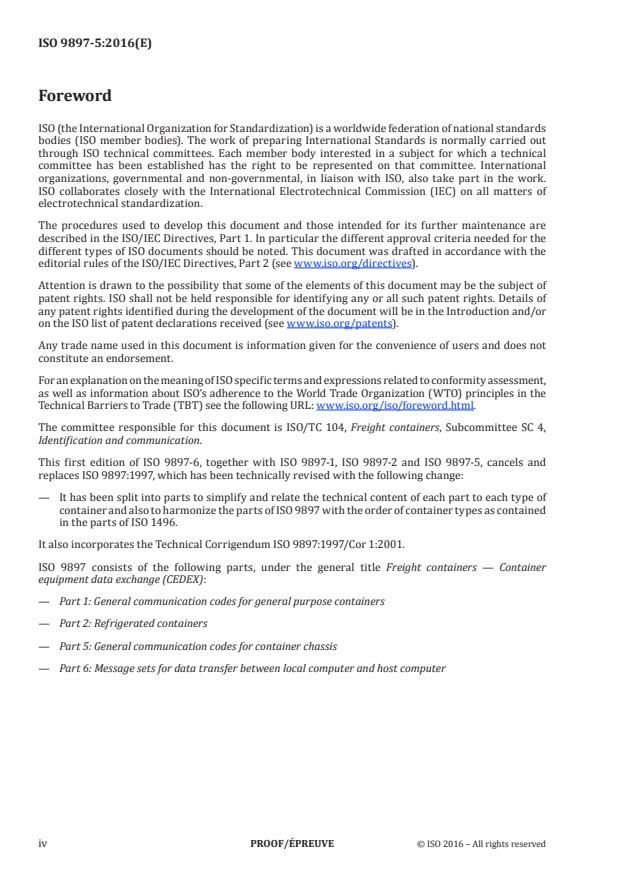 ISO/PRF 9897-5 is a draft published by the International Organization for Standardization (ISO). Its full title is "Freight containers — Container equipment data exchange (CEDEX) — Part 5: General communication codes for container chassis". This standard covers: Freight containers — Container equipment data exchange (CEDEX) — Part 5: General communication codes for container chassis