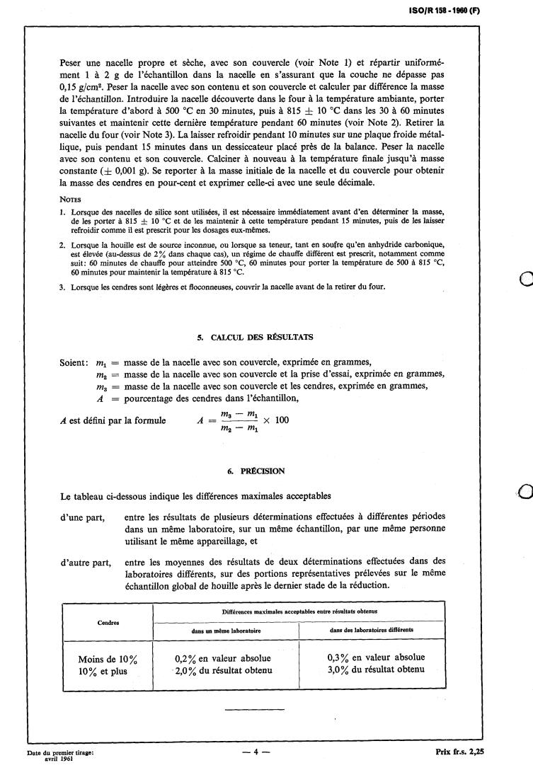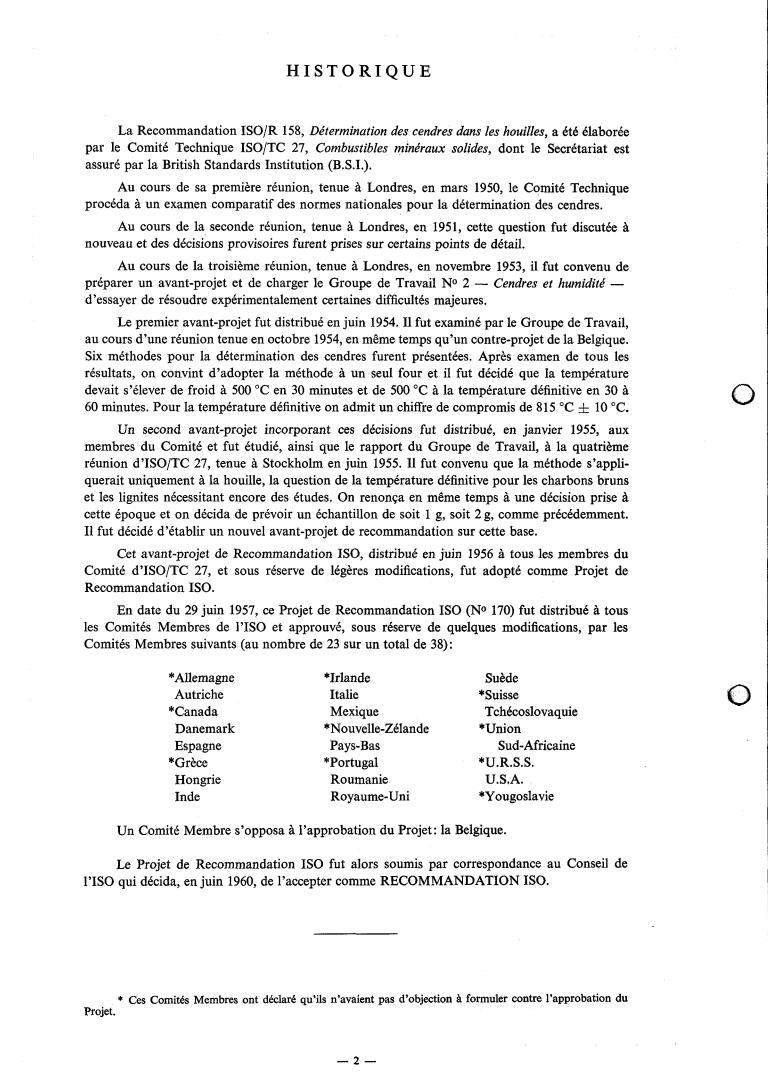 La Recommandation ISO/R 158, Dktermination des cendres dans les houilles, a été élaborée