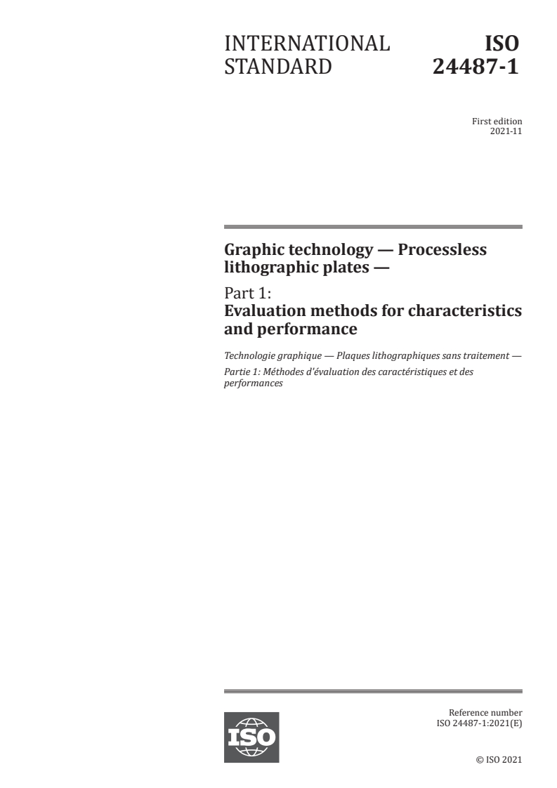 ISO 24487-1:2021 is a standard published by the International Organization for Standardization (ISO). Its full title is "Graphic technology — Processless lithographic plates — Part 1: Evaluation methods for characteristics and performance". This standard covers: This document applies to processless lithographic plates and specifies evaluation methods for lithographic plate characteristics, on-press development performance, usability and print image quality. It specifies measurement conditions for materials and equipment and provides guidelines for the selection of suitable processless lithographic plates by a printing organization and requirements for comparative assessment tests. The assessment of waterless lithographic plates is out of scope of this document.