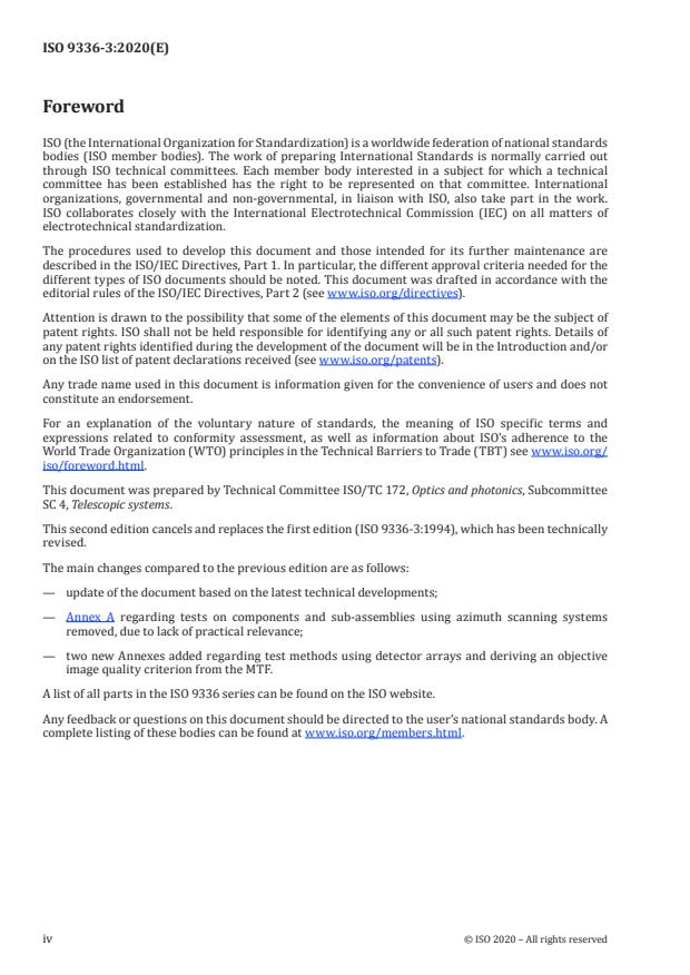 ISO 9336-3:2020 is a standard published by the International Organization for Standardization (ISO). Its full title is "Optics and photonics — Optical transfer function — Application — Part 3: Telescopes". This standard covers: This document specifies a method of testing telescopes in terms of imaging states aimed at making valid optical transfer function (OTF) measurements. This document includes two annexes (Annex A and B) that provide information on the more recent techniques for measuring optical transfer function and methods of deriving image quality criteria from such measurements.