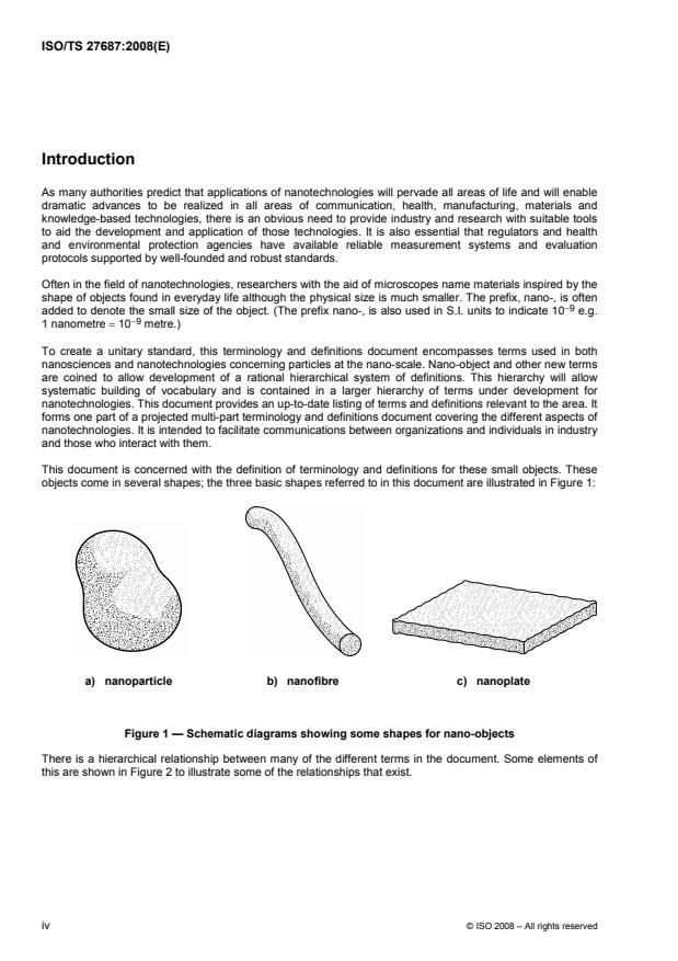 ISO/TS 27687:2008 is a technical specification published by the International Organization for Standardization (ISO). Its full title is "Nanotechnologies — Terminology and definitions for nano-objects — Nanoparticle, nanofibre and nanoplate". This standard covers: ISO/TS 27687:2008 lists unambiguous terms and definitions related to particles in the field of nanotechnologies. It is intended to facilitate communications between organizations and individuals in industry and those who interact with them.