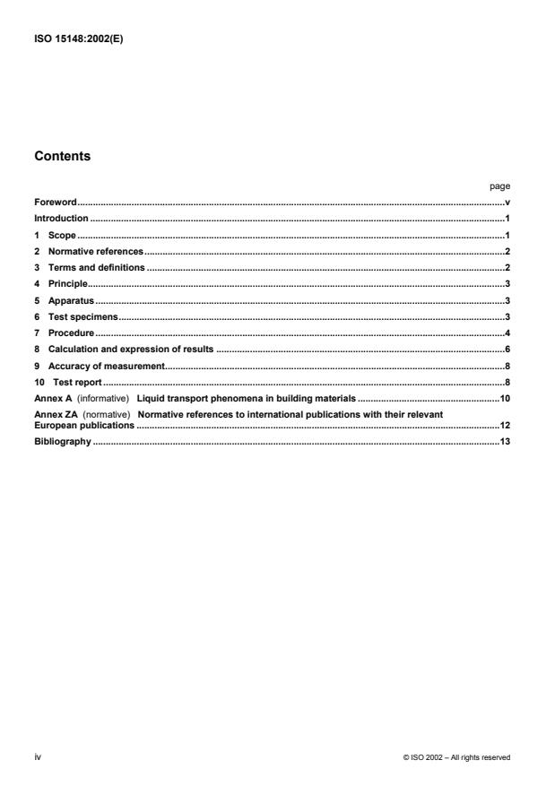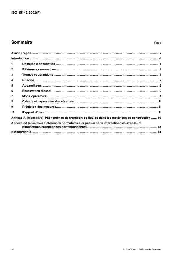 L'ISO 15148:2002 prescrit une méthode permettant de déterminer le coefficient d'absorption d'eau liquide à court terme, par immersion partielle sans gradient de température. Elle vise à évaluer la vitesse d'absorption d'eau par action capillaire lors de pluies continues ou battantes pendant le stockage sur chantier ou la construction sur des matériaux d'isolation ou autres qui sont normalement protégés. Cette méthode est applicable à des enduits ou revêtements qui sont soumis à essai avec le support sur lequel ils sont normalement appliqués. Elle n'est pas destinée à l'évaluation de l'absorption d'eau par des matériaux utilisés sous l'eau ou en contact avec des sols saturés, pour lesquels un essai par immersion totale est plus approprié.