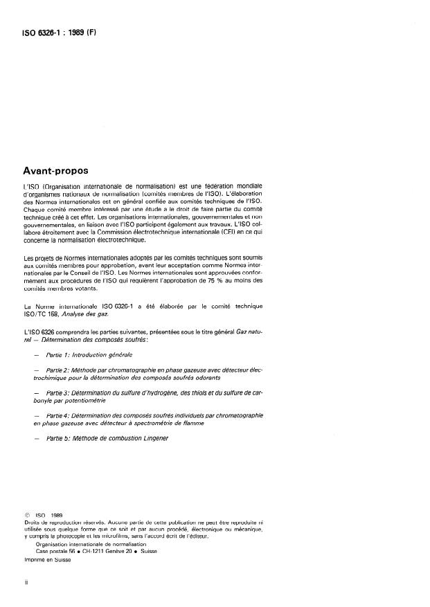 ISO 6326-1:1989 is a standard published by the International Organization for Standardization (ISO). Its full title is "Natural gas — Determination of sulfur compounds — Part 1: General introduction". This standard covers: Gives a rapid comparison of standardized methods and therefore provides information for the choice of the method. The other parts of ISO 6326 describe in detail the various standardized methods. Tabulates methods for the determination of sulfur components in natural gas.