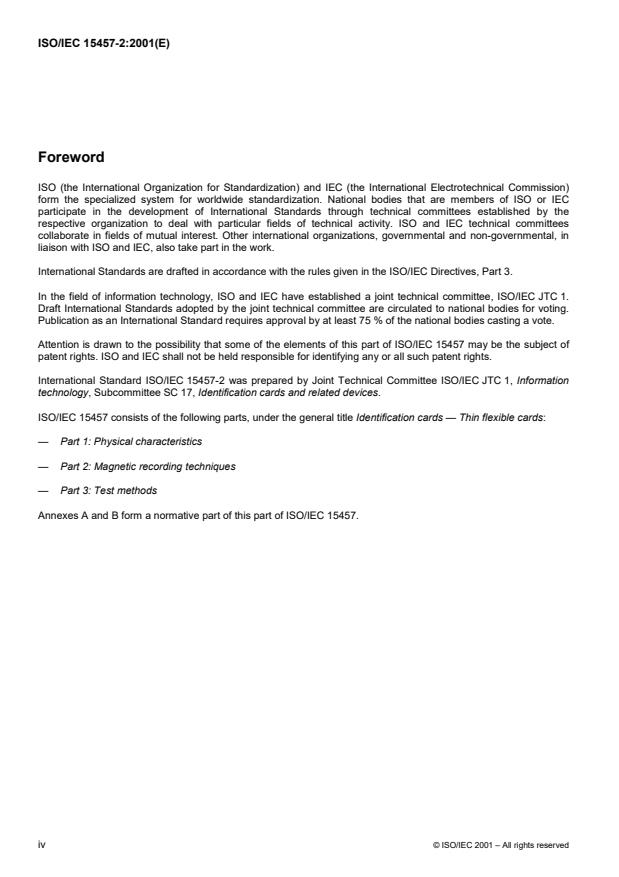 ISO/IEC 15457-2:2001 is a standard published by the International Organization for Standardization (ISO). Its full title is "Identification cards — Thin flexible cards — Part 2: Magnetic recording techniques". This standard covers: Identification cards — Thin flexible cards — Part 2: Magnetic recording techniques