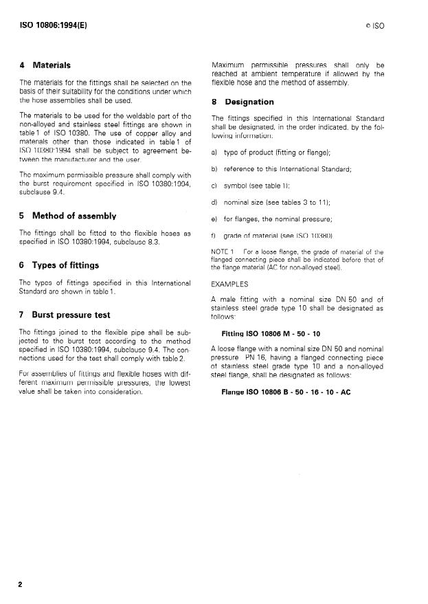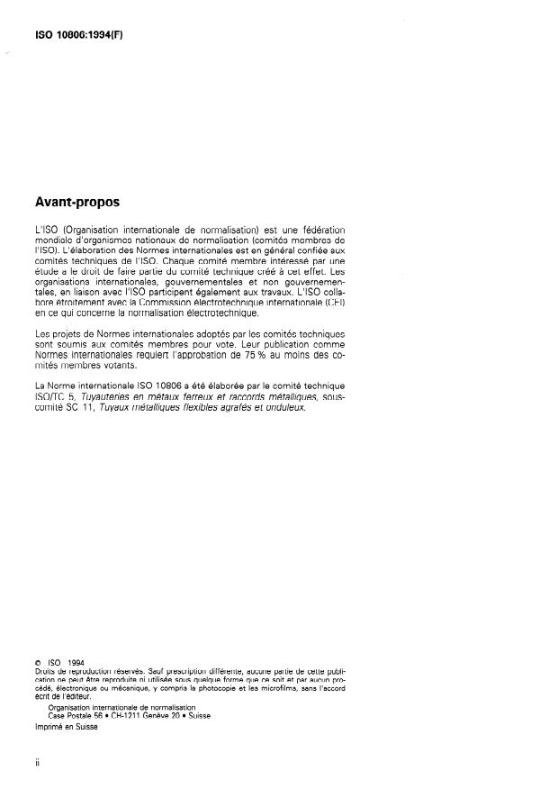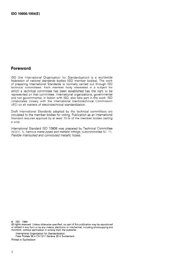 ISO 10806:1994 is a standard published by the International Organization for Standardization (ISO). Its full title is "Pipework — Non-alloyed and stainless steel fittings for corrugated flexible metallic hoses". This standard covers: Specifies the design characteristics of non-alloyed and stainless steel fittings for corrugated flexible metallic hose in accordance with the requirements of ISO 10380. These fittings are suitable for the majority of applications. The characteristics of other types of fittings used will be the subject of an agreement between the purchaser and the manufacturer.