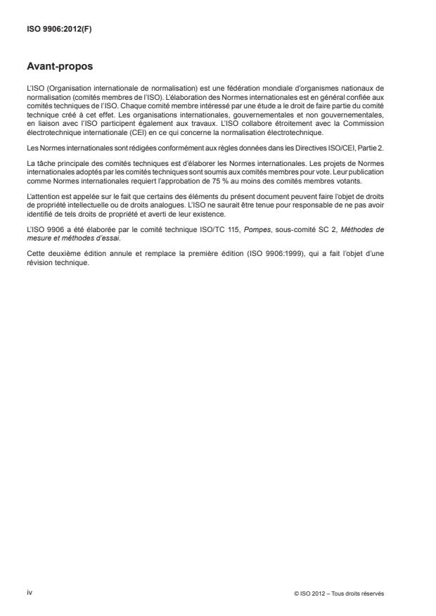 L'ISO 9906:2012 spécifie les essais de performance hydraulique pour l'acceptation par les clients de pompes rotodynamiques (pompes centrifuges, hélico-centrifuges et hélices). Elle est destinée à être utilisée pour l'essai de réception des pompes dans des installations d'essai des pompes, comme les laboratoires ou les installations d'essai des pompes du fabricant. L'ISO 9906:2012 peut s'appliquer aux pompes quelle que soit leur taille et à tous les liquides pompés qui se comportent comme de l'eau froide propre. Elle spécifie trois niveaux de réception: niveaux 1B, 1E et 1U pour des tolérances les plus serrées; niveaux 2B, 2U pour des tolérances plus larges; niveau 3B pour des tolérances encore plus larges. Elle est applicable soit à la pompe elle-même sans autre accessoire, soit à une combinaison associant une pompe à tout ou partie de ses accessoires en aval et/ou en amont.