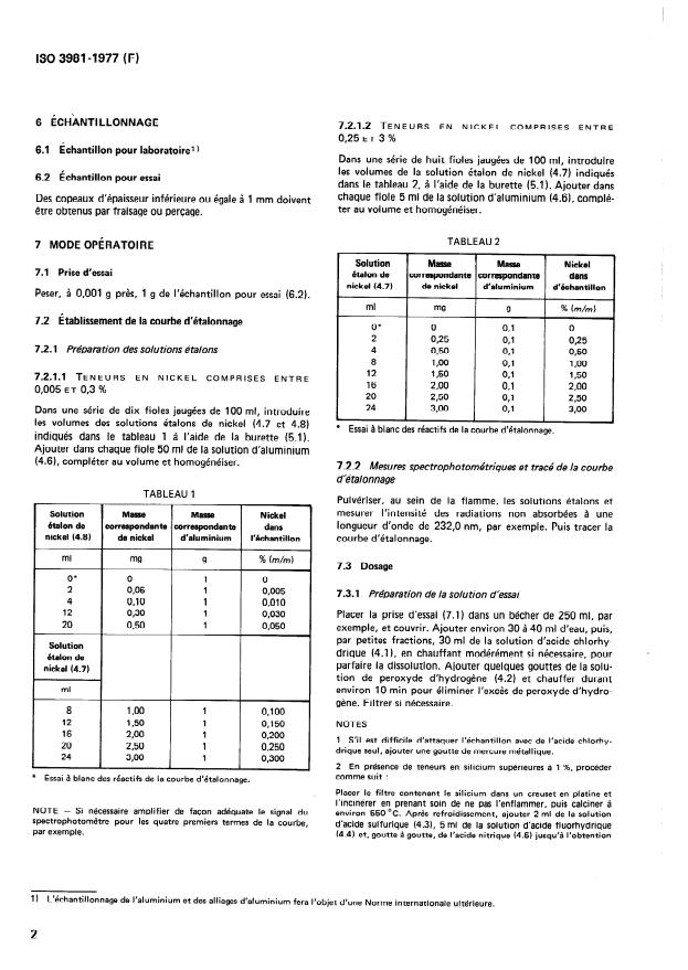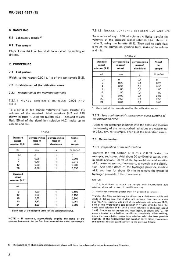 ISO 3981:1977 is a standard published by the International Organization for Standardization (ISO). Its full title is "Aluminium and aluminium alloys - Determination of nickel - Atomic absorption spectrophotometric method". This standard covers: The method is applicable to nickel contents between 0,005 and 3 % (m/m). Specifies principle, reagents, apparatus, sampling, procedure, expression of results and test report.