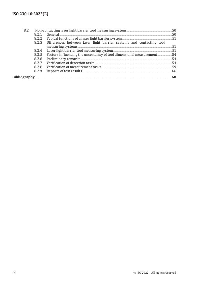 - Bore gauge and laser systems: Clauses specify characteristics and performance determination for bore gauges and verification/measurement tasks for laser light barrier systems.