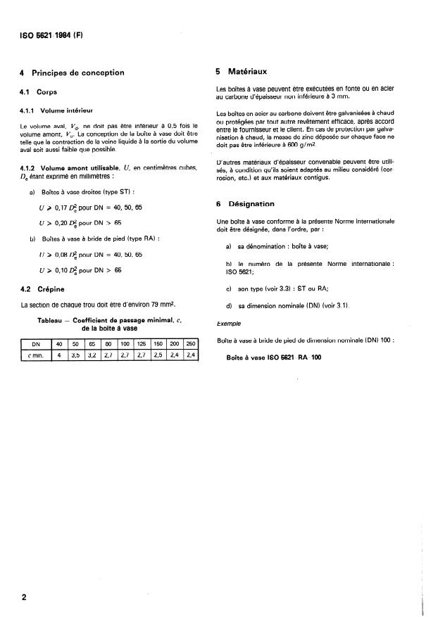 1.1 La présente Norme internationale spécifie les caractéristiques générales de conception des boîtes à vase utilisées entre les pompes et les assèchements des compartiments machines et des tunnels, pour la filtration grossière de l'eau de la cale des machines. 1.2 La présente Norme internationale ne précise pas les dimensions ni les matériaux des boîtes à vase. 1.3 La présente Norme internationale s'applique aux navires de haute mer et aux navires destinés à la navigation intérieure. NOTE -- L'attention des utilisateurs est attirée sur le fait que, tout en satisfaisant aux exigences de la présente Norme internationale, ils doivent aussi respecter les prescriptions légales, règles et règlements applicables au type de navire concerné.