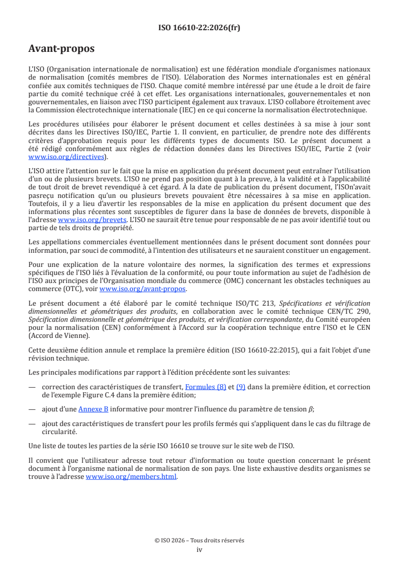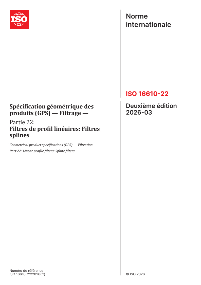 ISO 16610-22:2026 is a standard published by the International Organization for Standardization (ISO). Its full title is "Geometrical product specifications (GPS) — Filtration — Part 22: Linear profile filters: Spline filters". This standard covers: This document specifies linear spline filters for the filtration of surface profiles. It defines, in particular, how to separate large- and small-scale lateral components of surface profiles. The concepts presented for closed profiles are applicable to the case of roundness filtration. Where appropriate, these concepts can be extended to generalized closed profiles, especially for surface profiles with re-entrant features. Examples for the application of the spline filter are given in Annex A. The influence of the tension parameter on the large-scale lateral component of the profile is shown in Annex B.