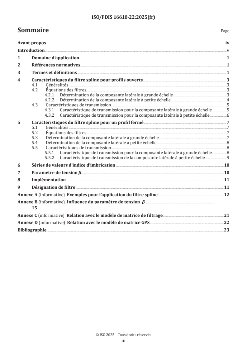 ISO/FDIS 16610-22:2025 is the ISO GPS (Geometrical Product Specifications) standard that specifies linear spline filters for profile filtration. The document defines how to separate large‑scale (long‑wave) and small‑scale (short‑wave) lateral components of surface profiles using spline‑based linear filters. Spline filters in this part of ISO 16610 are characterized by a 50% transmission for sinusoidal profiles at the cut‑off wavelength and include definitions and implementation guidance for both open and closed (roundness) profiles.