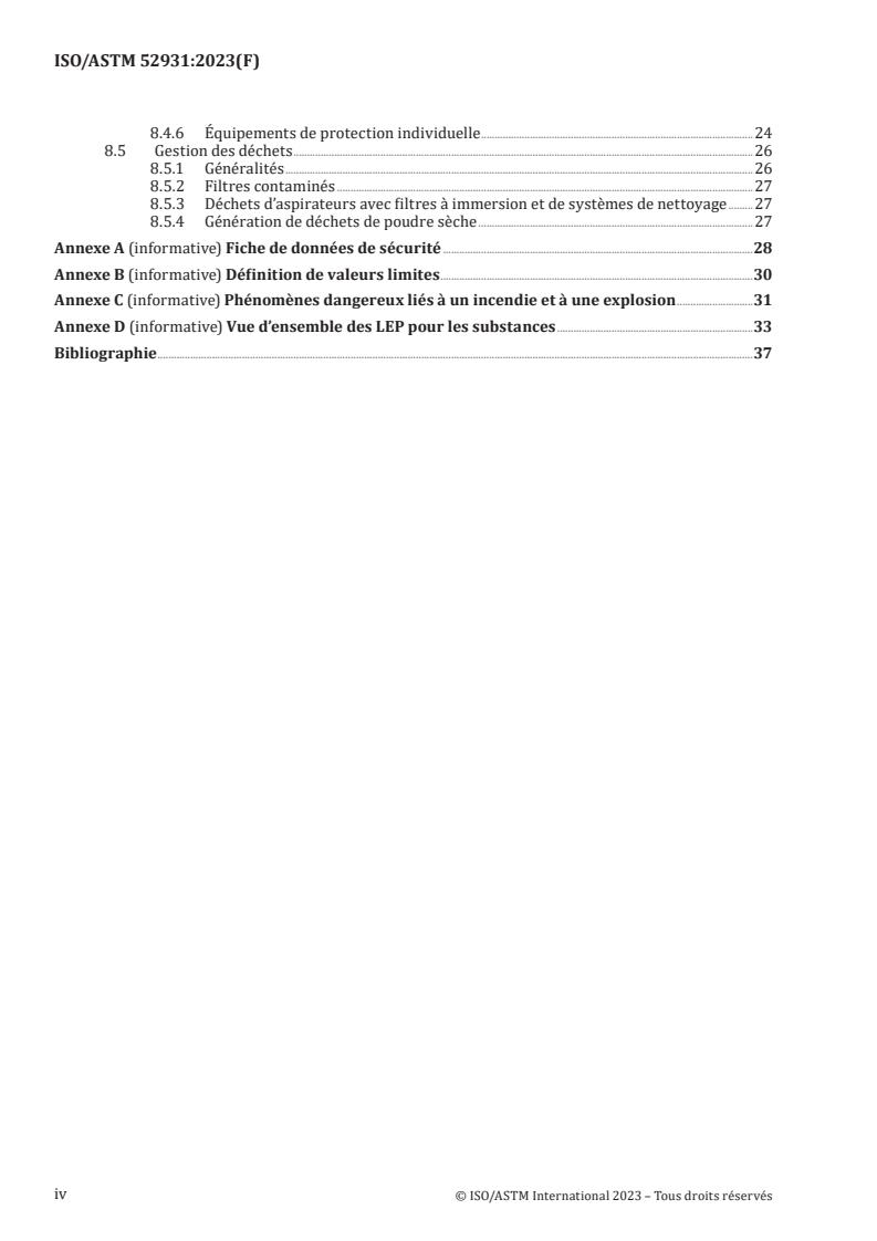 ISO/ASTM 52931:2023 focuses on practical EHS controls and a structured risk‑assessment methodology. Major topics include: