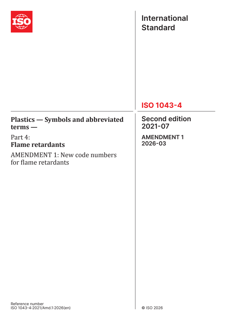 ISO 1043-4:2021/Amd 1:2026 is a standard published by the International Organization for Standardization (ISO). Its full title is "Plastics — Symbols and abbreviated terms — Part 4: Flame retardants — Amendment 1: New code numbers for flame retardants". This standard covers: Plastics — Symbols and abbreviated terms — Part 4: Flame retardants — Amendment 1: New code numbers for flame retardants