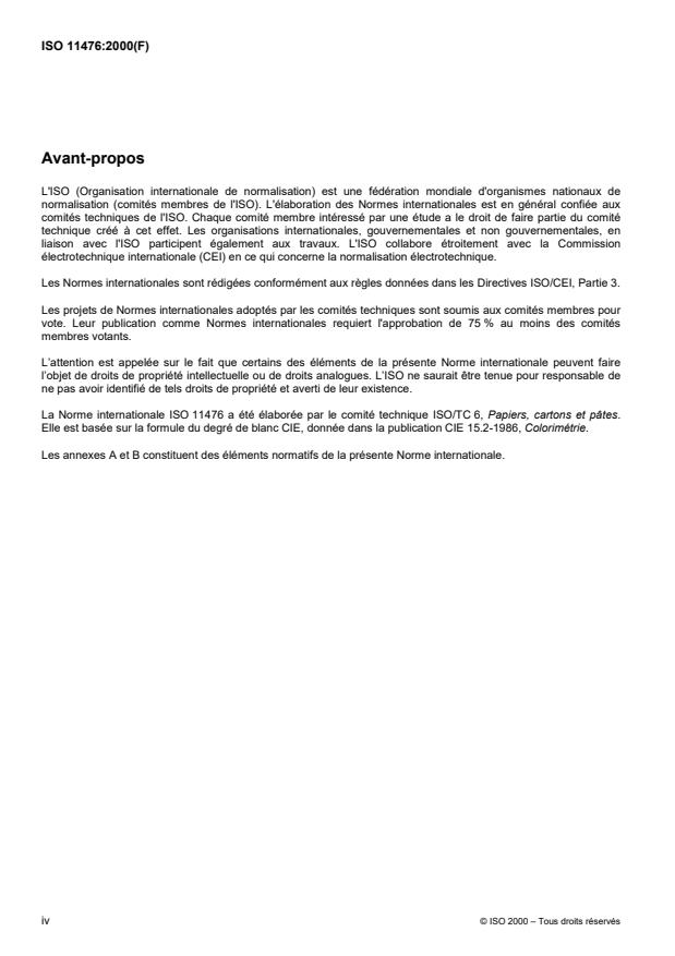 ISO11476:2000(E)iv©ISO2000–AllrightsreservedForewordISO(theInternationalOrganizationforStandardization)isaworldwidefederationofnationalstandardsbodies(ISOmemberbodies).TheworkofpreparingInternationalStandardsisnormallycarriedoutthroughISOtechnicalcommittees.Eachmemberbodyinterestedinasubjectforwhichatechnicalcommitteehasbeenestablishedhastherighttoberepresentedonthatcommittee.Internationalorganizations,governmentalandnon-governmental,inliaisonwithISO,alsotakepartinthework.ISOcollaboratescloselywiththeInternationalElectrotechnicalCommission(IEC)onallmattersofelectrotechnicalstandardization.InternationalStandardsaredraftedinaccordancewiththerulesgivenintheISO/IECDirectives,Part3.DraftInternationalStandardsadoptedbythetechnicalcommitteesarecirculatedtothememberbodiesforvoting.PublicationasanInternationalStandardrequiresapprovalbyatleast75%ofthememberbodiescastingavote.AttentionisdrawntothepossibilitythatsomeoftheelementsofthisInternationalStandardmaybethesubjectofpatentrights.ISOshallnotbeheldresponsibleforidentifyinganyorallsuchpatentrights.InternationalStandardISO11476waspreparedbyTechnicalCommitteeISO/TC6,Paper,boardandpulps.ItisbasedontheCIE-whitenessformula,publishedinCIEPublication15.2-1986,Colorimetry.AnnexesAandBformanormativepartofthisInternationalStandard.SIST ISO 11476:2004