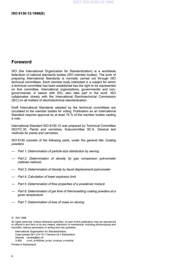 ISO 8130-12:1998 is a standard published by the International Organization for Standardization (ISO). Its full title is "Coating powders — Part 12: Determination of compatibility". This standard covers: Coating powders — Part 12: Determination of compatibility