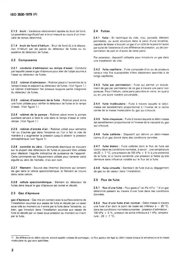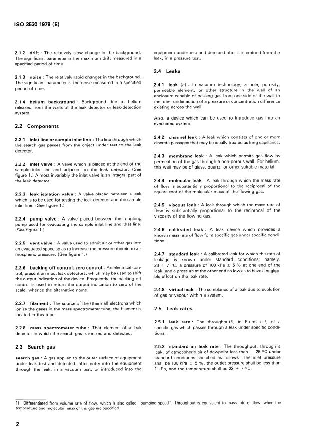 ISO 3530:1979 is a standard published by the International Organization for Standardization (ISO). Its full title is "Vacuum technology - Mass-spectrometer-type leak-detector calibration". This standard covers: Only leak detectors are described which have an integral high vacuum system to maintain the sensing element of the mass spectrometer at a low pressure. Two procedures are outlined, one to determine the minimum detectable leak rate and the other for determination of the minimum detectable concentration ratio.