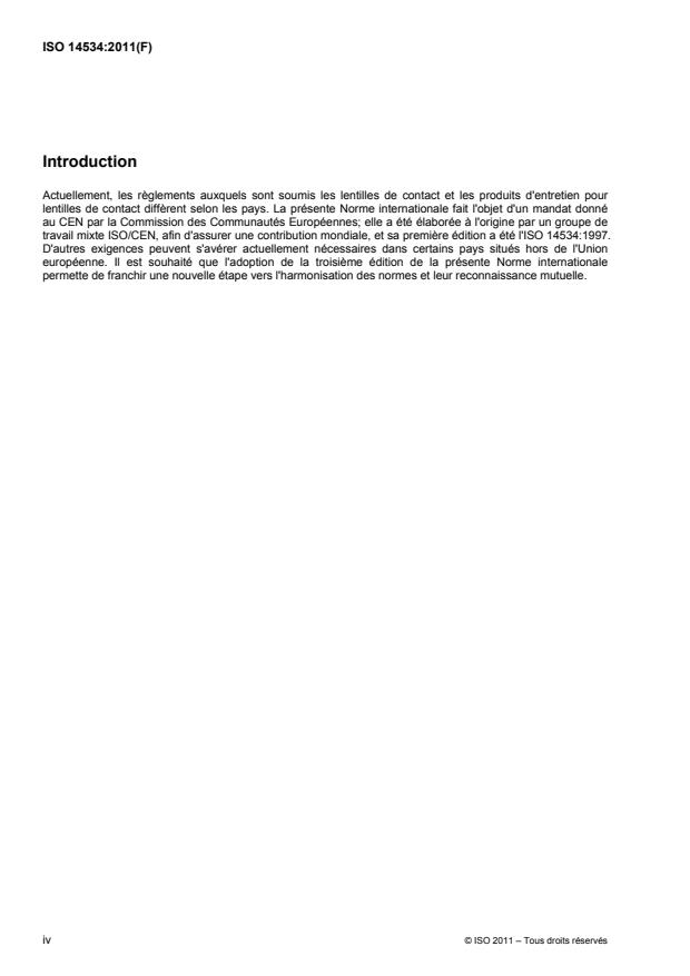 L'ISO 14534:2011 spécifie les exigences de sécurité et de performance s'appliquant aux lentilles de contact, produits d'entretien des lentilles de contact et autres accessoires utilisés avec les lentilles de contact. L'ISO 14534:2011 ne traite pas de sécurité électrique ni de considérations de compatibilité électromagnétique potentiellement liées à l'utilisation d'équipements électriques avec les lentilles de contact et/ou les produits d'entretien pour lentilles de contact.