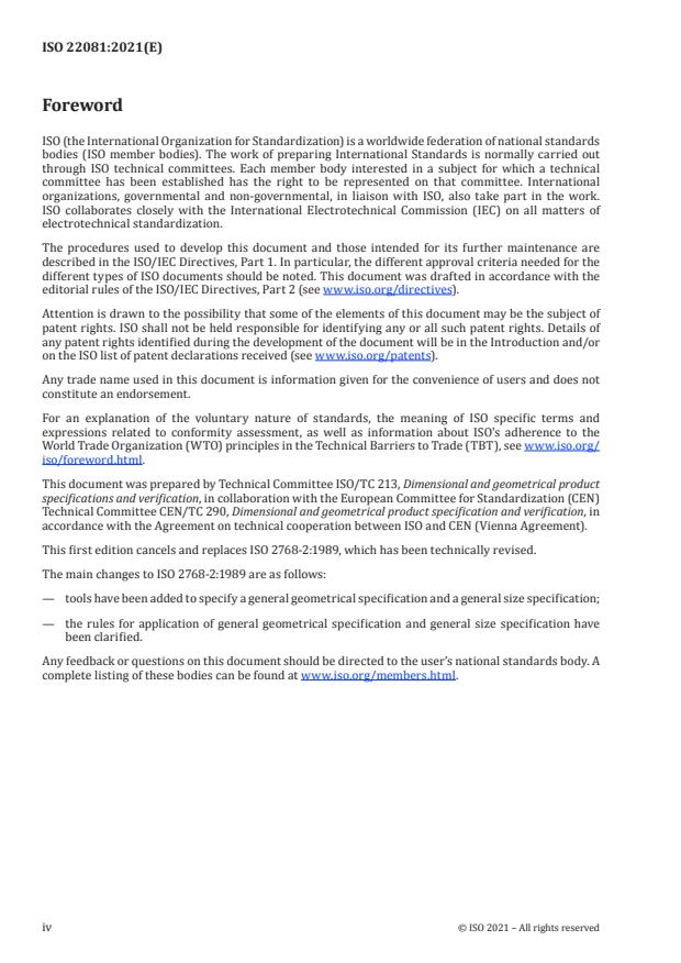 ISO 22081:2021 is a standard published by the International Organization for Standardization (ISO). Its full title is "Geometrical product specifications (GPS) — Geometrical tolerancing — General geometrical specifications and general size specifications". This standard covers: This document gives rules for definition and interpretation of general geometrical specifications and general size specifications defined according to ISO 8015:2011, 5.12. General specifications defined in other standards, and the link to these standards, are not covered by this document. The general geometrical specifications and general size (linear or angular) specifications defined in this document apply only to integral features (including features of size). These specifications do not apply to derived features or integral lines (see ISO 17450-1 for the definitions of integral features and derived features). Dimensions other than linear or angular sizes (see ISO 14405-2) are not covered by this document.