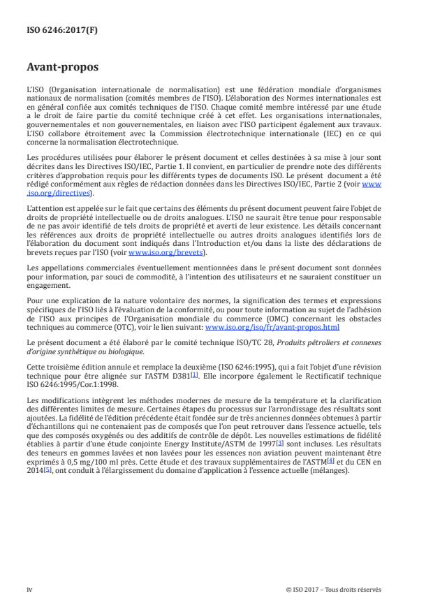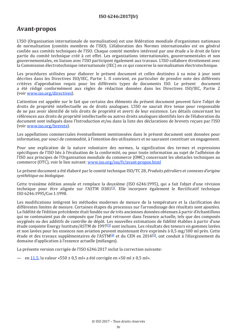ISO 6246:2017 spécifie une méthode de détermination de la teneur en gommes actuelles dans les essences aviation et de la teneur en gomme dans les essences automobiles et les distillats volatils. Ce document comprend dans son domaine d'application les produits contenant de l'éthanol (jusqu'à une fraction volumique de 85 %), des composés oxygénés de type éther ainsi que des additifs de contrôle de dépôts. Pour la détermination de la teneur en gommes dans le carburant éthanol pour automobiles (E85), aucune valeur de fidélité n'est disponible (voir 14.1). Pour les essences autres que pour l'aviation, une procédure de détermination de la fraction insoluble dans l'heptane du résidu est également décrite.