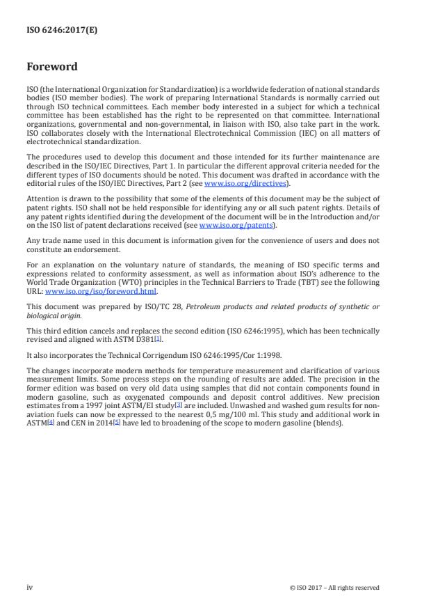 ISO 6246:2017 specifies a method for determining the existent gum content of aviation fuels and the gum content of motor gasoline or other volatile distillates. It includes the determination of products containing ethanol (up to a volume fraction of 85 %) and ether-type oxygenates and deposit control additives. For determination of gum content in automotive ethanol (E85) fuel, no precision data is available (see 14.1). For non-aviation fuels, a procedure for the determination of the heptane-insoluble portion of the residue is also described.