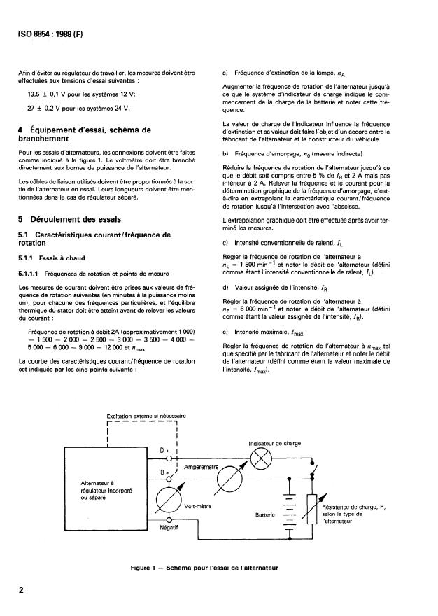 ISO 8854:1988 is a standard published by the International Organization for Standardization (ISO). Its full title is "Road vehicles — Alternators with regulators — Test methods and general requirements". This standard covers: Specifies test methods and general requirements for the determination of the electrical characteristic data of alternators for road vehicles. Applies to alternators, cooled according to the manufacturer's instructions, mounted on internal combustion engines. Figure 1 shows a diagram for alternator testing.