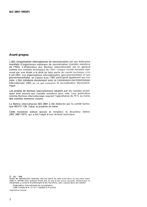 ISO 2881:1992 - Tabac et produits du tabac -- Détermination de la teneur en alcaloides -- Méthode spectrométrique