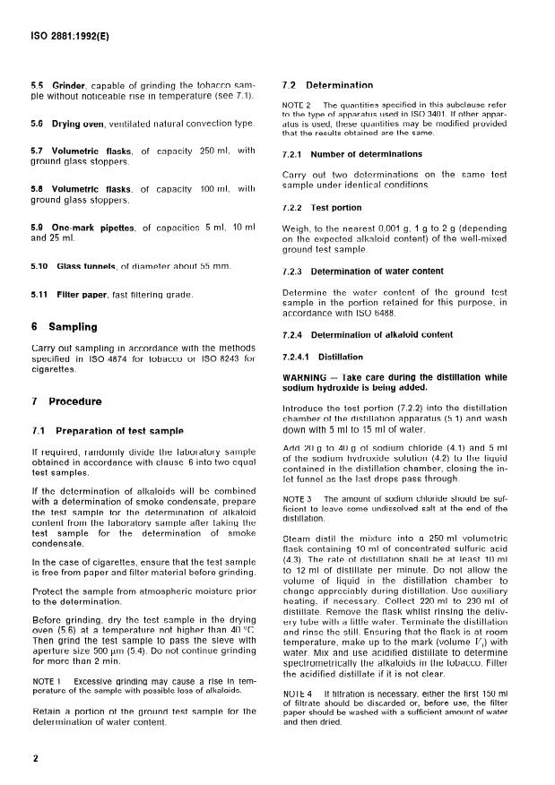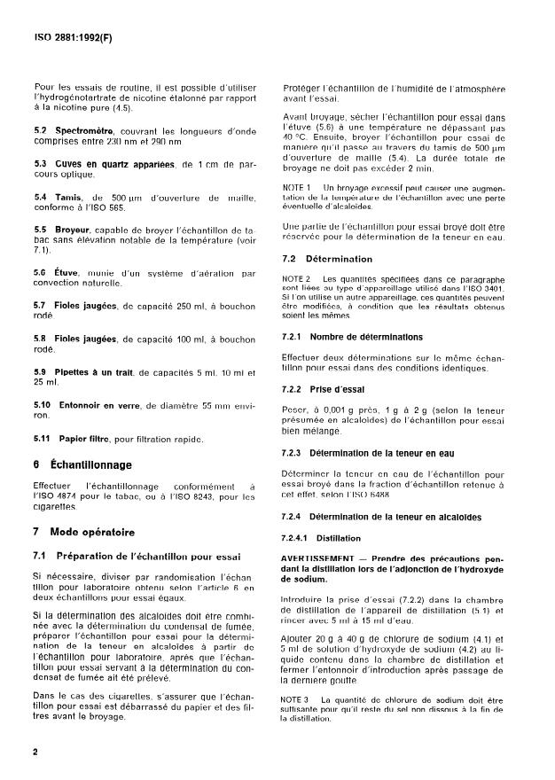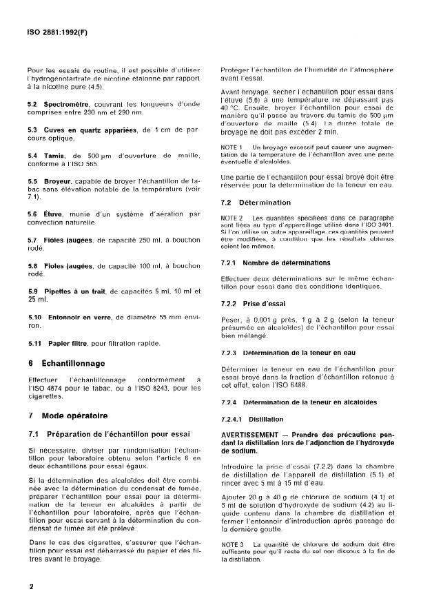 Keywords: ISO 2881:1992, tobacco alkaloid determination, nicotine analysis, spectrometric method, steam distillation, tobacco testing, analytical standard.