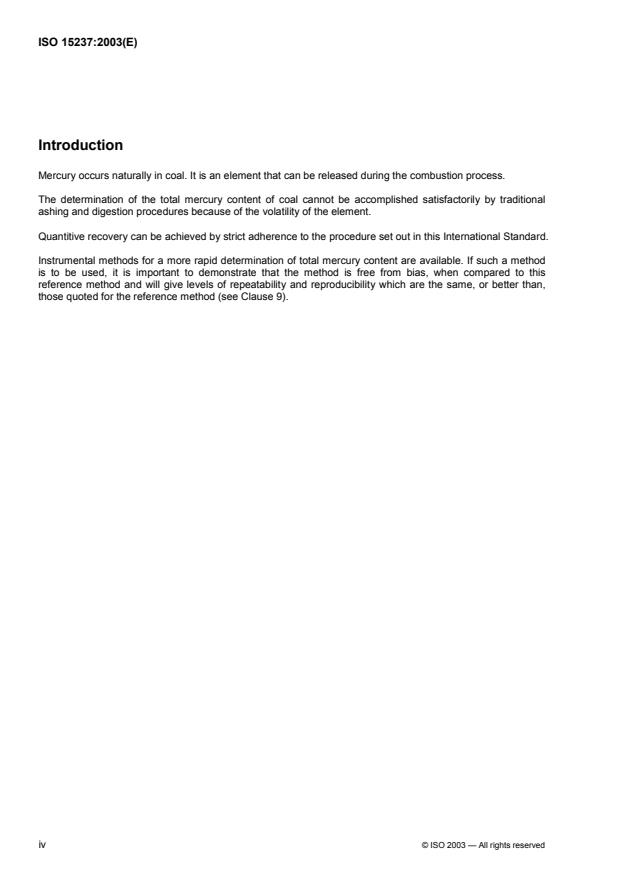 ISO 15237:2003 is a standard published by the International Organization for Standardization (ISO). Its full title is "Solid mineral fuels — Determination of total mercury content of coal". This standard covers: ISO 15237:2003 specifies a procedure for the determination of the total mercury content of coal.