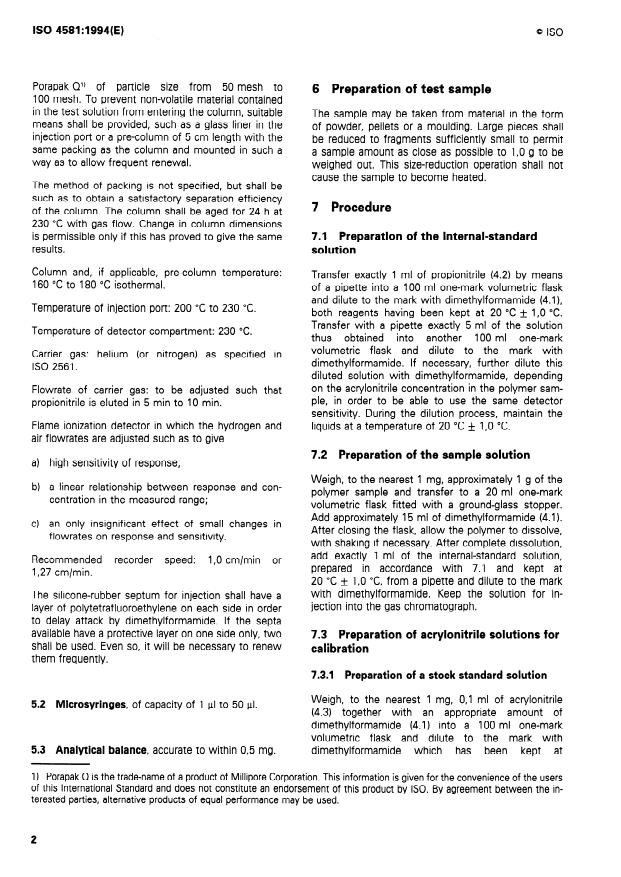 ISO 4581:1994 is a standard published by the International Organization for Standardization (ISO). Its full title is "Plastics - Styrene/acrylonitrile copolymers - Determination of residual acrylonitrile monomer content - Gas chromatography method". This standard covers: The principle of the method specified is dissolving a test portion in dimethylformamide and injecting a small volume of the solution into a gas chromatograph equipped with flame ionization detector to separate and detect the volatile components. The solvent contains a known amount of propionitrile or acetonitrile as an internal standard for quantitative evaluation. With this method, a lower detection limit of the order of 3 ppm of acrylonitrile in the copolymer may be expected. To obtain a lower detection limit of the order of 0,3 ppm to 0,4 ppm, an alternative method is specified in annex A.
