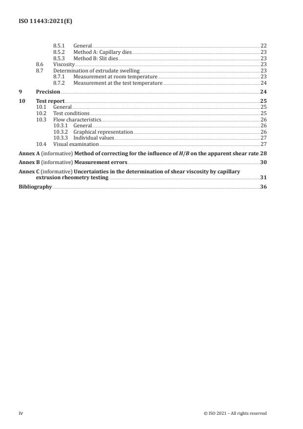 This document specifies methods for determining the fluidity of plastics melts subjected to shear stresses at rates and temperatures approximating to those arising in plastics processing. Testing plastics melts in accordance with these methods is of great importance since the fluidity of plastics melts is generally not dependent solely on temperature, but also on other parameters; in particular shear rate and shear stress. The methods described in this document are useful for determining melt viscosities from 10 Pa∙s to 107 Pa∙s, depending on the measurement range of the pressure and/or force transducer and the mechanical and physical characteristics of the rheometer. The shear rates occurring in extrusion rheometers range from 1 s−1 to 106 s−1. Elongational effects at the die entrance cause extrudate swelling at the die exit. Methods for assessing extrudate swelling have also been included. The rheological techniques described are not limited to the characterization of wall-adhering thermoplastics melts only; for example, thermoplastics exhibiting "slip" effects[1][2] and thermosetting plastics can be included. However, the methods used for determining the shear rate and shear viscosity are invalid for materials which are not wall-adhering. Nevertheless, this document can be used to characterize the rheological behaviour of such fluids for a given geometry.