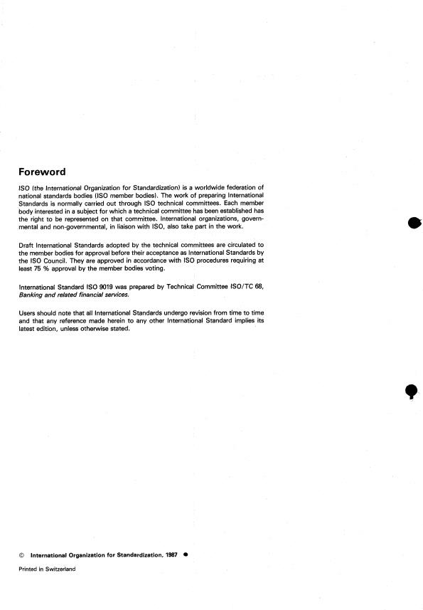 ISO 9019:1987 is classified under the following ICS (International Classification for Standards) categories: 03.060 - Finances. Banking. Monetary systems. Insurance. The ICS classification helps identify the subject area and facilitates finding related standards.