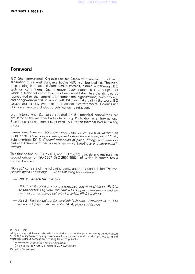 ISO 2507-1:1995 is a standard published by the International Organization for Standardization (ISO). Its full title is "Thermoplastics pipes and fittings - Vicat softening temperature - Part 1: General test method". This standard covers: The method specified is based on determining the temperature at which a standard indenter, under a force of 50 N ± 1 N, penetrates 1 mm into the surface of a test piece cut from the wall of a pipe or fitting while the temperature is raised at a constant rate. Is applicable only to thermoplastics materials for which it is possible to measure the temperature at which the rate of softening becomes rapid. Is based on ISO 306:1994 which, however, applies to materials in the form of sheets.