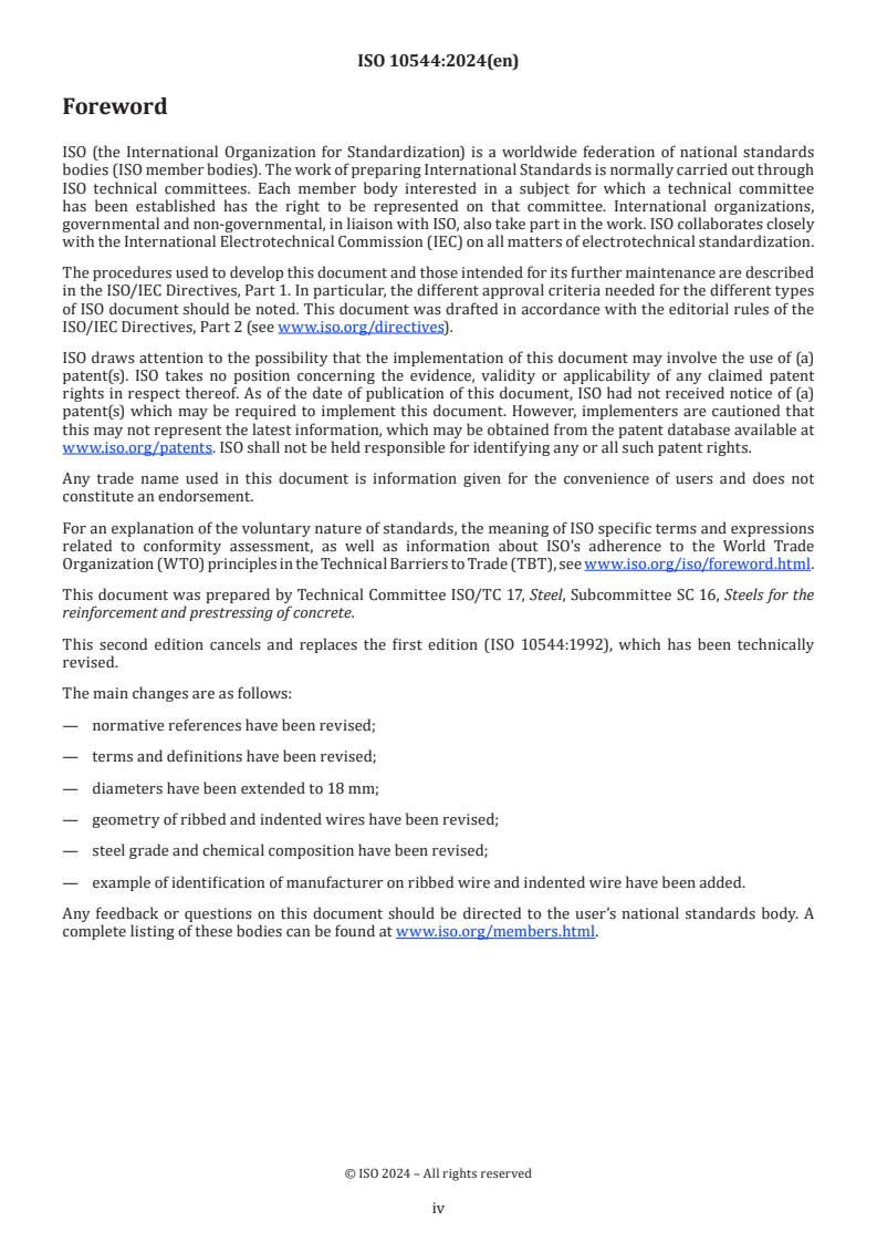 ISO 10544:2024 specifies technical requirements for cold-reduced steel wire used for the reinforcement of concrete and for manufacture of welded fabric (wire mesh). The second edition updates the 1992 version and covers wire produced from rod by drawing through dies or rollers (coil form straightened products included). Example steel grades given are CRB500 and CRB540H; other grades may be used by agreement. Wires produced from finished products (plates, rails) are outside the scope.