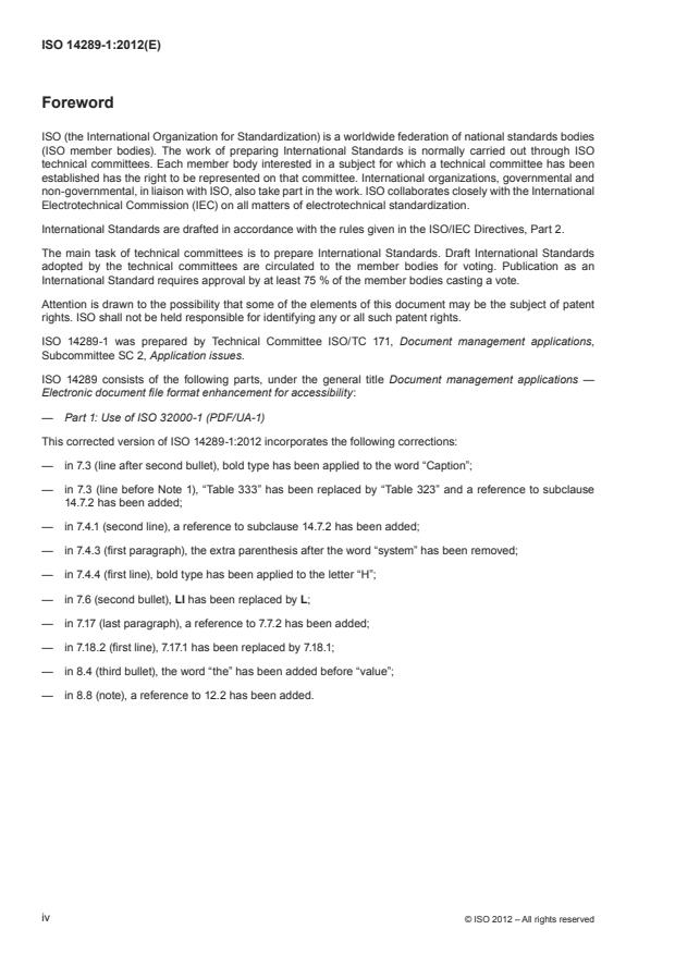 ISO 14289-1:2012 specifies how to use ISO 32000-1 (PDF/UA-1) to produce accessible electronic documents. ISO 14289-1:2012 is not applicable to: specific processes for converting paper or electronic documents to the PDF/UA format; specific technical design, user interface, implementation, or operational details of rendering; specific physical methods of storing these documents, such as media and storage conditions; required computer hardware and/or operating systems.