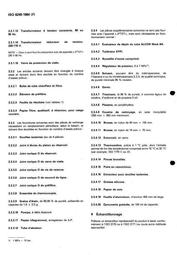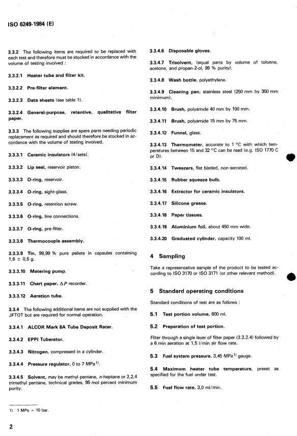 ISO 6249:1984 is a standard published by the International Organization for Standardization (ISO). Its full title is "Petroleum products — Gas turbine fuels — Determination of thermal oxidation stability — JFTOT method". This standard covers: Petroleum products — Gas turbine fuels — Determination of thermal oxidation stability — JFTOT method