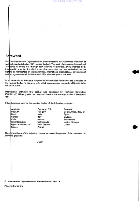 F d reword IS0 (the International Organization for Standardization) is a worldwide federation of nati na1 standards bodies (IS0 member bodies). The work of developing International Sta dards is carried out through IS0 technical committees. Every member body inte sted in a subject for which a technical committee has been authorized has the righ to be represented on that committee. International organizations, governmental and on-governmental, in liaison with ISO, also take part in the work. t Dra International Standards adopted by the technical committees are circulated to the ember bodies for approval before their acceptance as International Standards by the I O Council. t tional Standard IS0 5666/2 was developed by Technical Committee C 147, Water qualify, and was circulated to the member bodies in December een approved by the member bodies of the following countries : Australia Germany, F.R. Romania Belgium Hungary South Africa, Rep. of Brazil India Spain Canada Italy Sweden Chile Mexico Switzerland Czechoslovakia Netherlands United Kingdom Egypt, Arab Rep. of New Zealand USSR France Poland ber body of the following country expressed disapproval of the document on Japan O International Organization for Standardization, 1983 O Printed in Switzerland SIST ISO 5666-2:1997