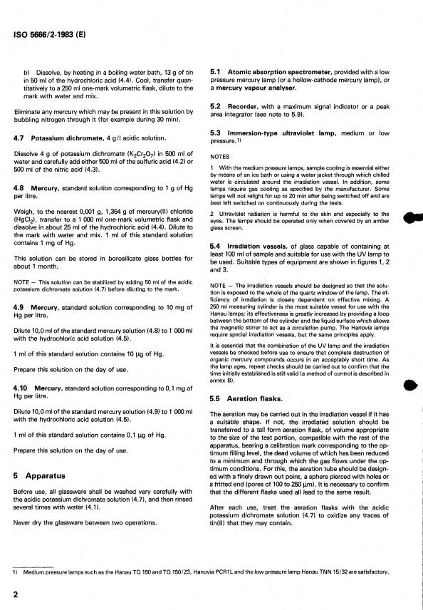 IS0 5666/2-1983 (E) b) Dissolve, by heating in a boiling water bath, 13 g of tin in 50 ml of the hydrochloric acid (4.4). Cool, transfer quan- titatively to a 250 ml one-mark volumetric flask, dilute to the mark with water and mix. Eliminate any mercury which may be present in this solution by bubbling nitrogen through it (for example during 30 min). 4.7 Potassium dichromate, 4 g/l acidic solution. Dissolve 4 g of potassium dichromate (K2Cr207) in 500 ml of water and carefully add either 500 ml of the sulfuric acid (4.2) or 500 ml of the nitric acid (4.3). 4.8 per litre. Weigh, to the nearest 0,001 g, 1,354 g of mercury(l1) chloride (HgCI,), transfer to a 1 O00 ml one-mark volumetric flask and dissolve in about 25 ml of the hydrochloric acid (4.4). Dilute to the mark with water and mix. 1 ml of this standard solution contains 1 mg of Hg. Mercury, standard solution corresponding to 1 g of Hg This solution can be stored in borosilicate glass bottles for about 1 month. NOTE - This solution can be stabilized by adding 50 ml of the acidic potassium dichromate solution (4.7) before diluting to the mark. 4.9 Hg per litre. Dilute 10,O ml of the standard mercury solution (4.8) to 1 O00 ml with the hydrochloric acid solution (4.5). Mercury, standard solution corresponding to 10 mg of 1 ml of this standard solution contains 10 pg of Hg. Prepare this solution on the day of use. 4.10 Hg per litre. Dilute 10.0 ml of the standard mercurysolution (4.9) to 1 O00 ml with the hydrochloric acid solution (4.5). 1 ml of this standard solution contains 0,l pg of Hg. Prepare this solution on the day of use. Mercury, standard solution corresponding to O, 1 mg of 5 Apparatus Before use, all glassware shall be washed very carefully with the acidic potassium dichromate solution (4.71, and then rinsed several times with water (4.1). Never dry the glassware between two operations. 5.1 Atomic absorption spectrometer, provided with a low pressure mercury lamp (or a hollow-cathode mercury lamp), or a mercury vapour analyser. 5.2 area integrator (see note to 5.9). 5.3 Immersion-type ultraviolet lamp, medium or low pressure.1) NOTES 1 With the medium pressure lamps, sample cooling is essential either by means of an ice bath or using a water jacket through which chilled water is circulated around the irradiation vessel. In addition, some lamps require gas cooling as specified by the manufacturer. Some lamps will not relight for up to 20 min after being switched off and are best left switched on continuously during the tests. 2 Ultraviolet radiation is harmful to the skin and especially to the eyes. The lamps should be operated only when covered by an amber glass screen. Recorder, with a maximum signal indicator or a peak 5.4 Irradiation vessels, of glass capable of containing at least 100 ml of sample and suitable for use with the UV lamp to be used. Suitable types of equipment are shown in figures 1, 2 and 3. NOTE - The irradiation vessels should be designed so that the solu- tion is exposed to the whole of the quartz window of the lamp. The ef- ficiency of irradiation is closely dependent on effective mixing. A 250 ml measuring cylinder is the most suitable vessel for use with the Hanau lamps; its effectiveness is greatly increased by providing a loop between the bottom of the cylinder and the liquid surface which allows the magnetic stirrer to act as a circulation pump. The Hanovia lamps require special irradiation vessels, but the same principles apply. It is essential that the combination of the UV lamp and the irradiation vessels be checked before use to ensure that complete destruction of organic mercury compounds occurs in an acceptably short time. As the lamp ages, repeat checks should be carried out to confirm that the time initially established is still valid la method of control is described in annex 6). 5.5 Aeration flasks. The aeration may be carried out in the irradiation vessel if it has a suitable shape. If not