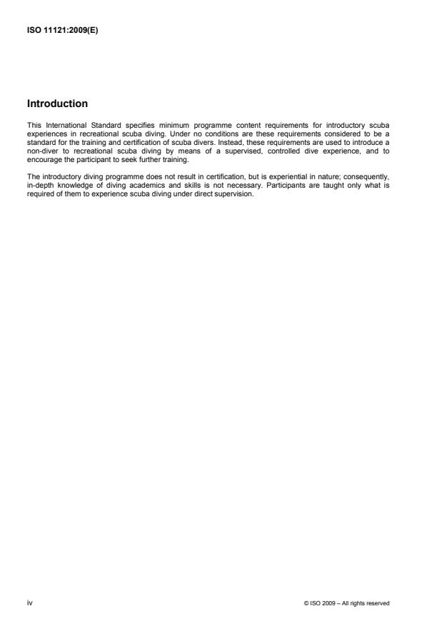 ISO 11121:2009 specifies minimum requirements for training organizations that offer introductory scuba experience training programmes to non-divers. ISO 11121:2009 applies to programmes that include participants being taken into an open water environment. It does not apply to programmes that are exclusively conducted in a confined water environment (e.g. swimming pools). ISO 11121:2009 also specifies the conditions under which this service is to be provided, which supplement the general requirements for recreational diving services specified in ISO 24803.