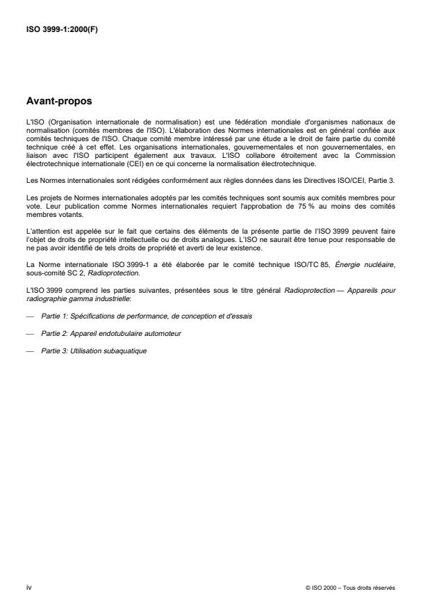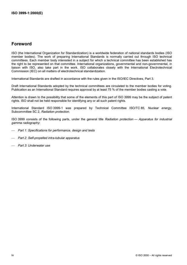 ISO 3999-1:2000 is a standard published by the International Organization for Standardization (ISO). Its full title is "Radiation protection — Apparatus for industrial gamma radiography — Part 1: Specifications for performance, design and tests". This standard covers: Radiation protection — Apparatus for industrial gamma radiography — Part 1: Specifications for performance, design and tests
