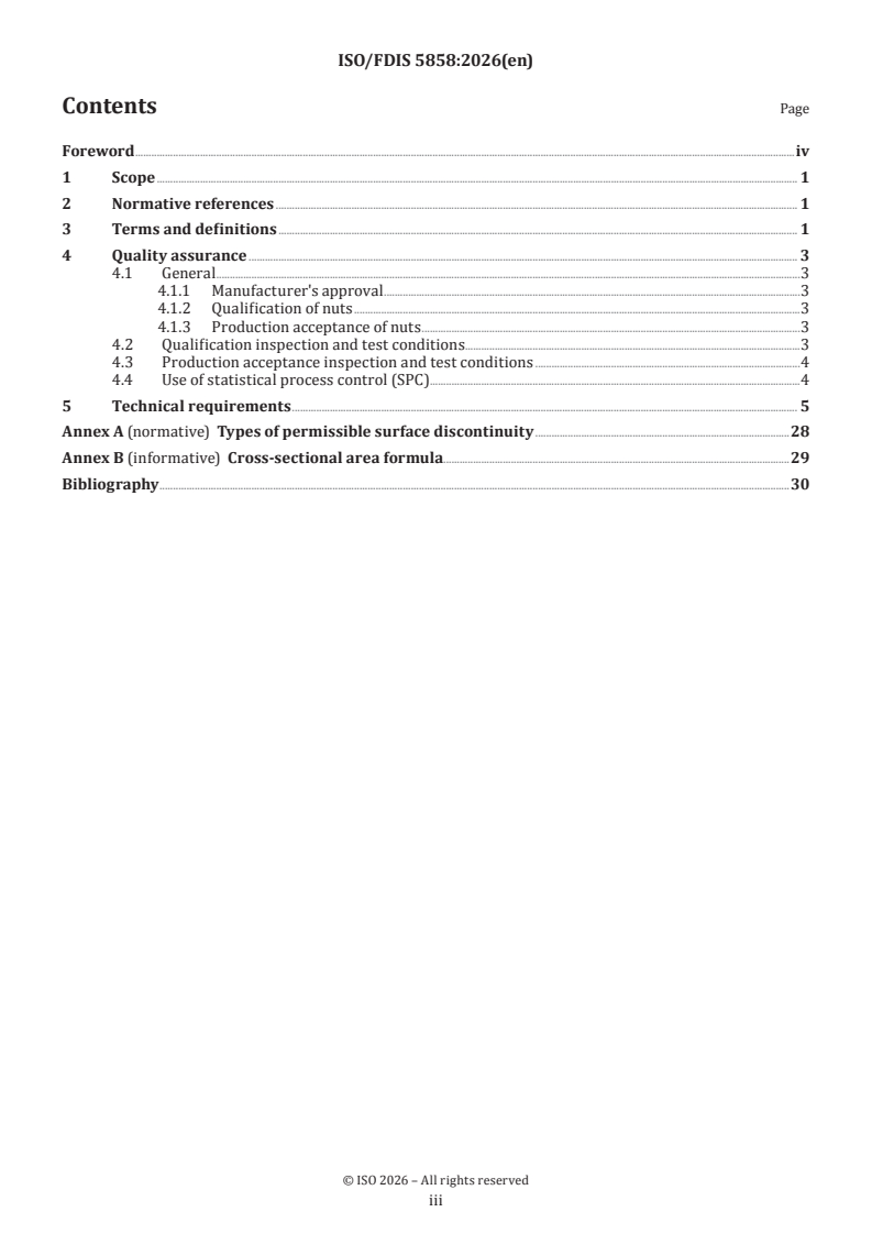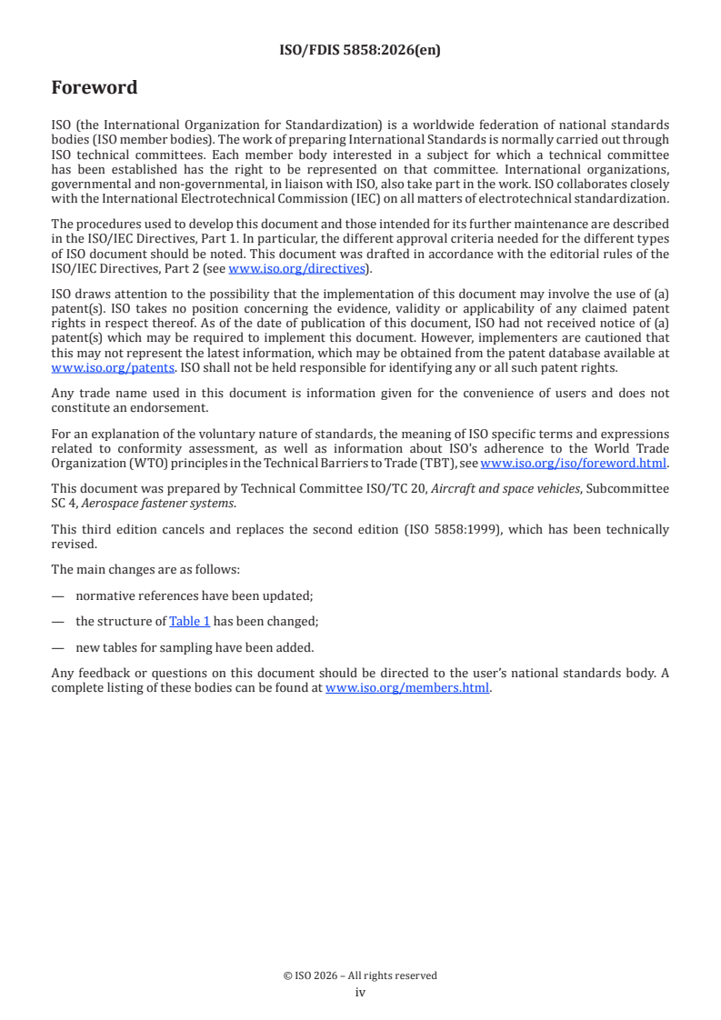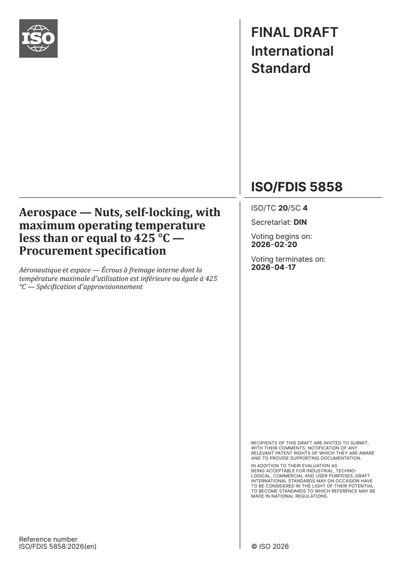 ISO/FDIS 5858 - Aerospace — Nuts, self-locking, with maximum operating temperature less than or equal to 425 °C — Procurement specification Released:6. 02. 2026