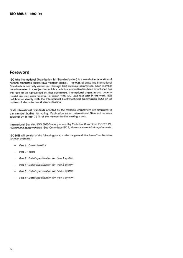 ISO 8668-5:1992 defines the detail specification for Type 3 Terminal Junction Systems (TJS) used in aircraft electrical installations. It specifies design characteristics and the required type-approval, production and quality tests for modular feed-through and feed-back junctions, grounding modules, in-line splices and associated tracks, brackets and contacts. This part is intended to be read in conjunction with ISO 8668-1 (general characteristics) and ISO 8668-2 (tests).